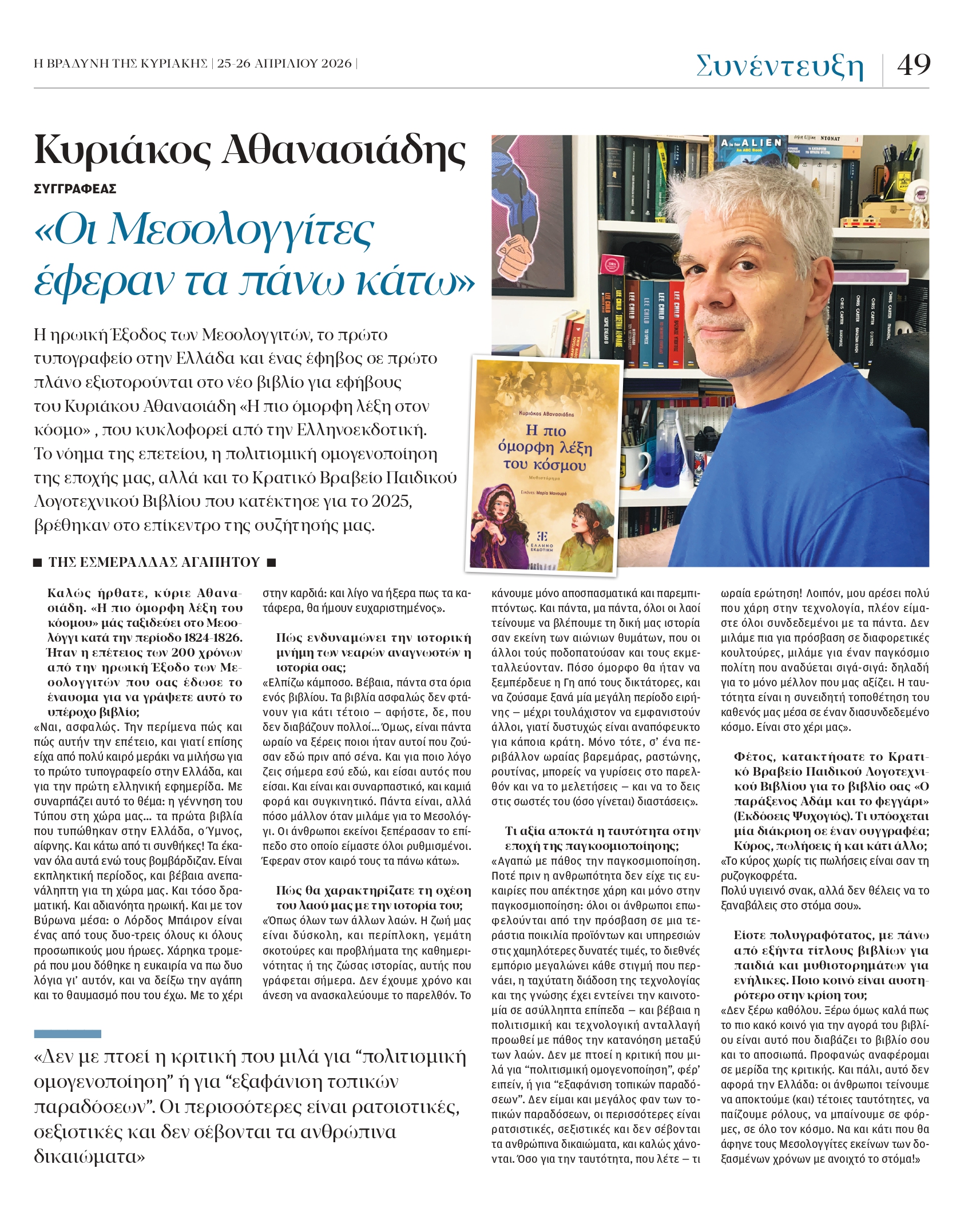 Συνέντευξη του Κυριάκου Αθανασιάδη στην Εσμεράλδα Αγαπητού για την ΒΡΑΔΥΝΗ ΤΗΣ ΚΥΡΙΑΚΗΣ που θα κυκλοφορήσει αυτήν την Κυριακή 26 Απριλίου 2026, με αφορμή το βιβλίο του 'Η πιο όμορφη λέξη του κόσμου"