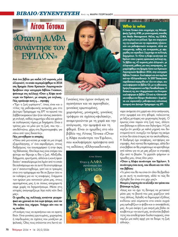 "Όταν η Άλφα συνάντησε τον Έψιλον". Συνέντευξη της Λίτσας Τότσκα στη ΒΡΑΔΥΝΗ ΤΗΣ ΚΥΡΙΑΚΗΣ (φύλλο 10&11/01/2026)