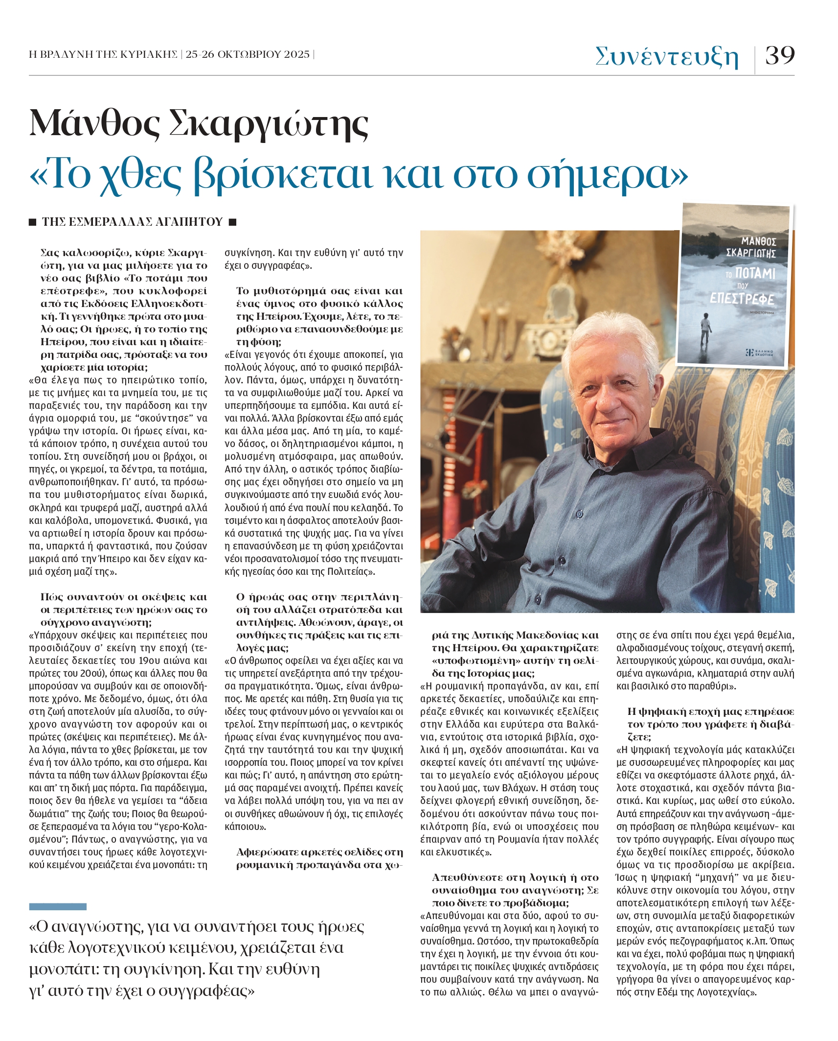 Ολοσέλιδη συνέντευξη του Μάνθου Σκαργιώτη για το βιβλίο του "Το ποτάμι που επέστρεφε" στην εφημερίδα ΒΡΑΔΥΝΗ ΤΟΥ ΣΑΒΒΑΤΟΚΥΡΙΑΚΟΥ.