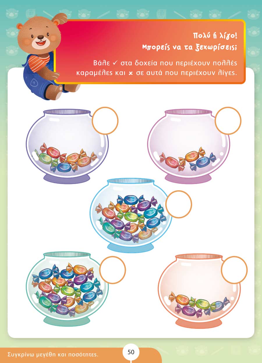 -Αναγνωρίζουν μεγέθη, ποσότητες και εξοικειώνονται με τις έννοιες του χώρου (πάνω – κάτω, δεξιά – αριστερά κ.λπ.).