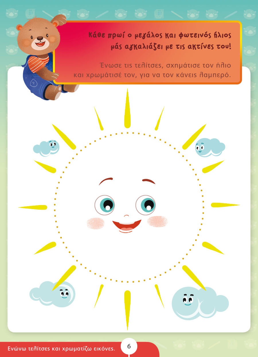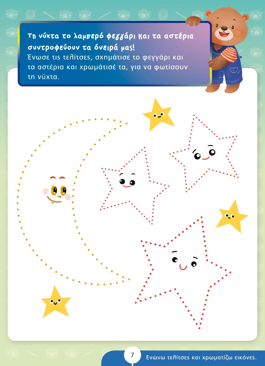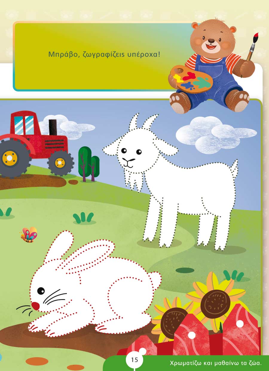 Με τις δραστηριότητες του βιβλίου, που πλαισιώνονται από πλούσια εικονογράφηση, τα παιδιά αναπτύσσουν τη δημιουργικότητα και τη φαντασία τους, εξασκούν την παρατηρητικότητά τους και τη λεπτή κινητική δεξιότητα της γραφής.