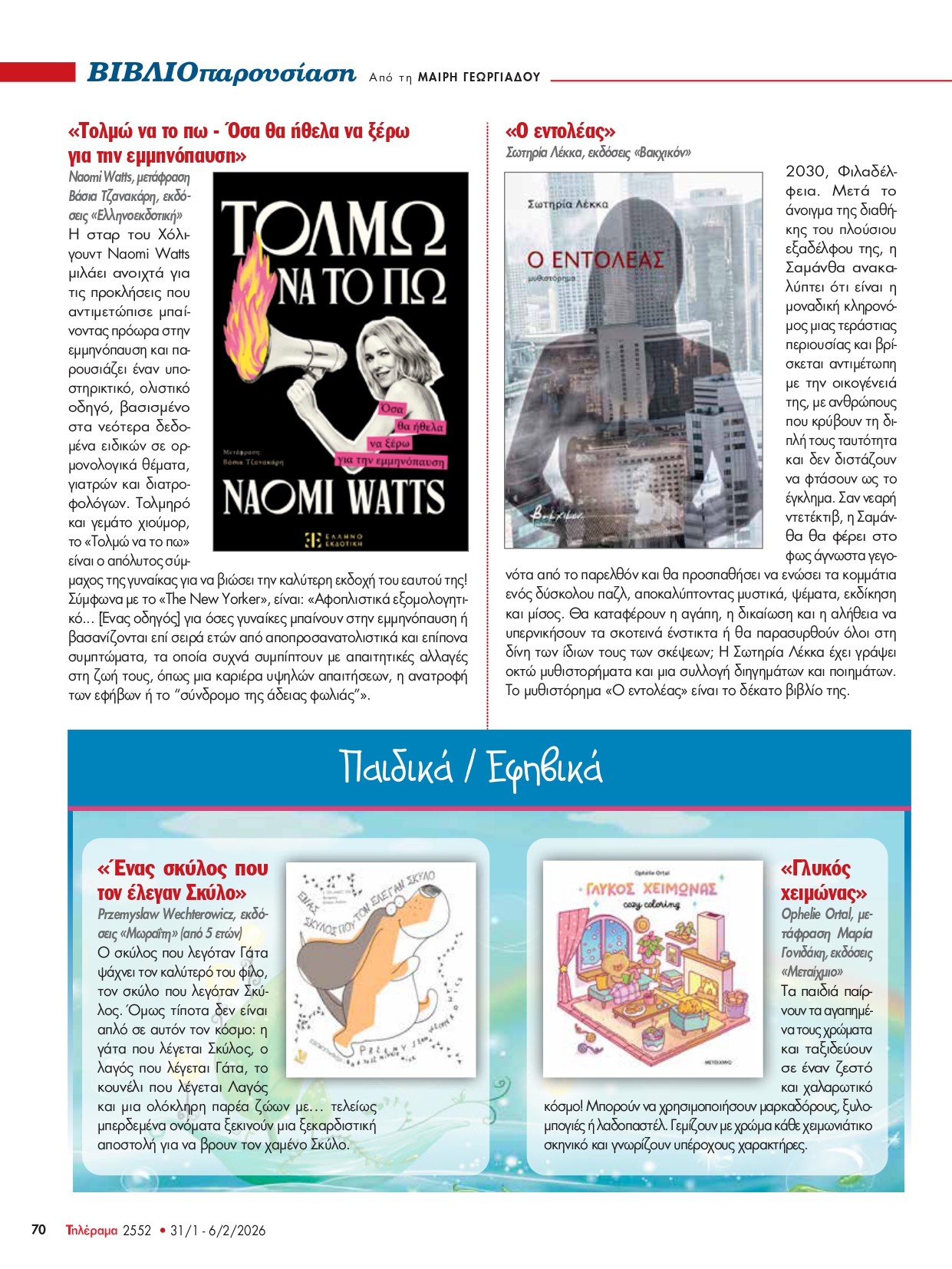 Το περιοδικό ΤΗΛΕΡΑΜΑ στη σελίδα βιβλίου που επιμελείται η Μαίρη Γεωργιάδου προτείνει το βιβλίο της Ναόμι Γουότς "Τολμώ να το πω" (τεύχος 30/01/2026-05/02/2026)