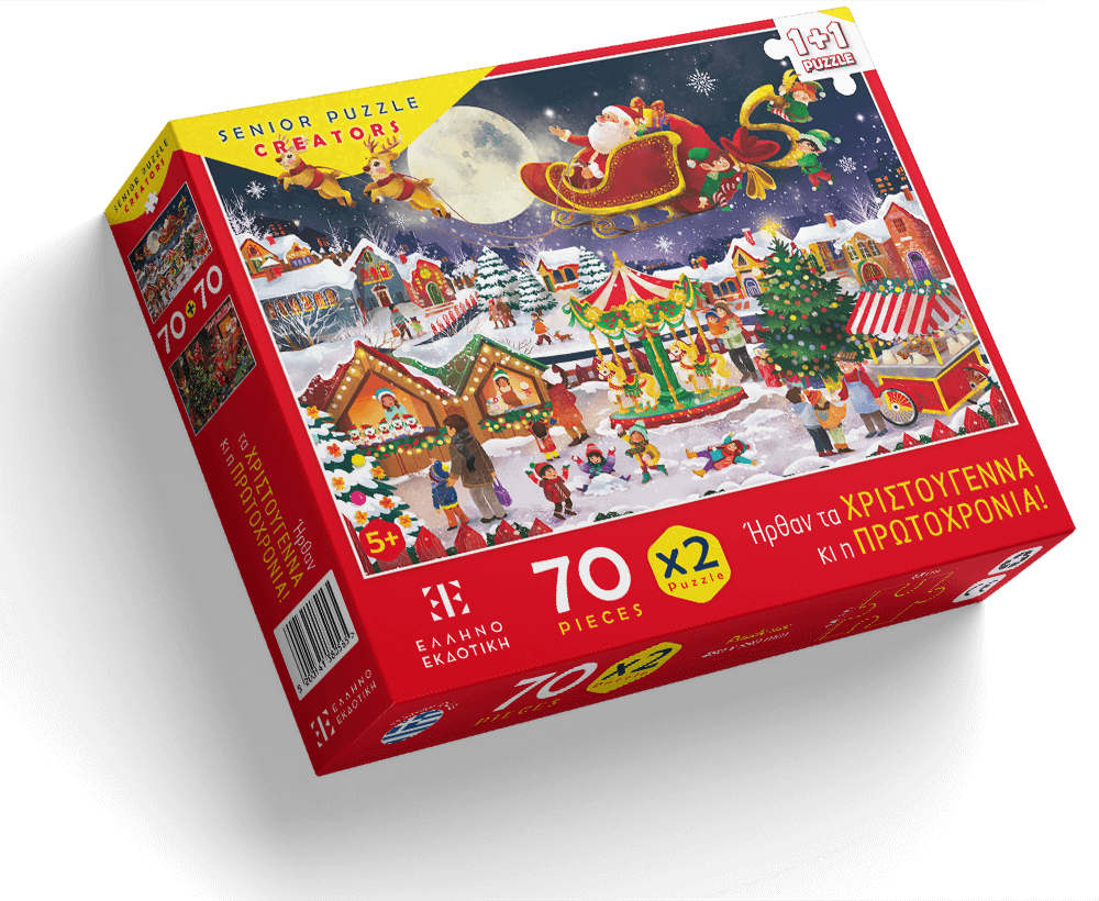 in the second image, happy children and their parents spend festive moments around the Christmas tree. Each image consists of 70 puzzle pieces.